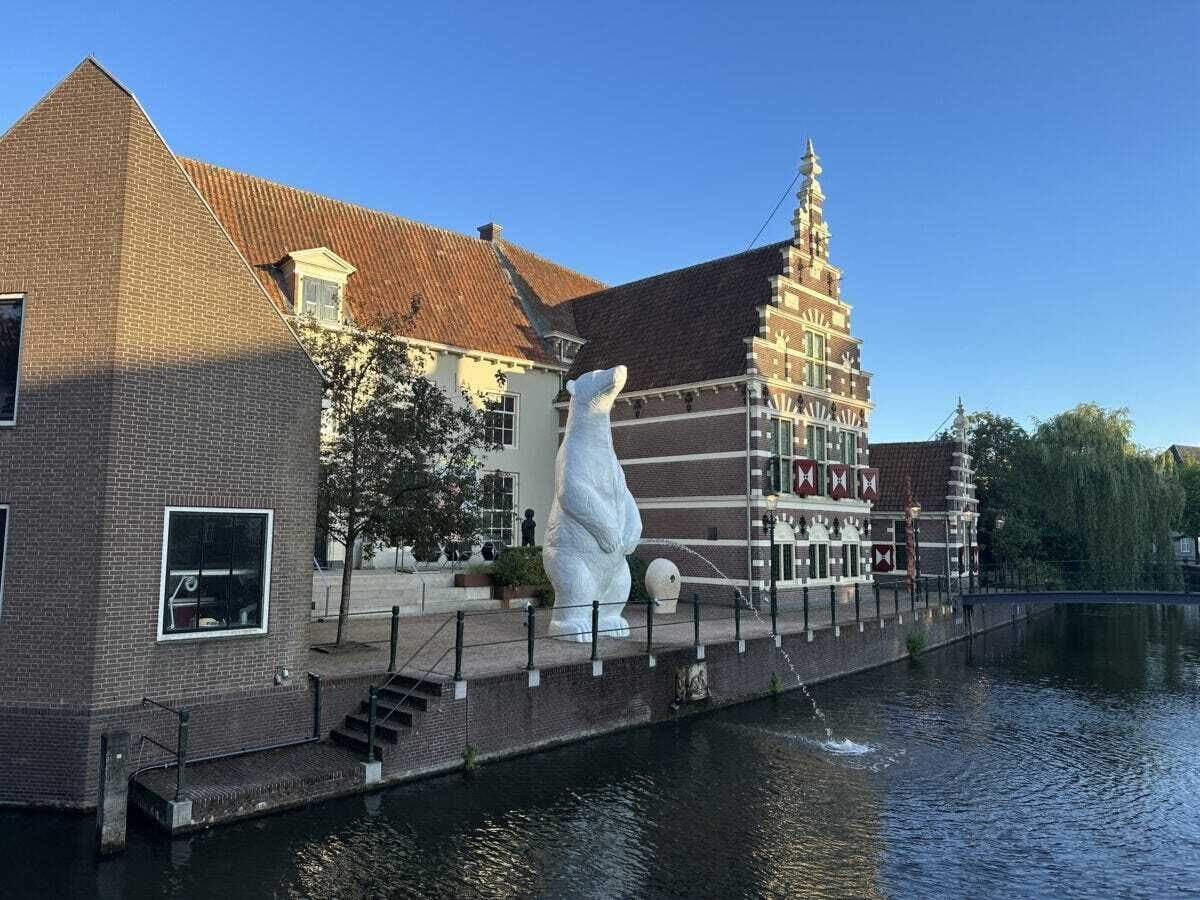 Positioned near the Groninger Museum, facing the central station, the statue features, (there’s no other way to say it) a large white polar bear urinating into the canal.