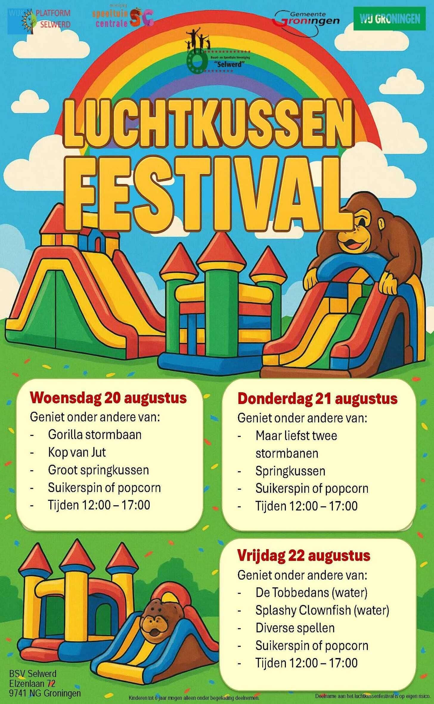BSV Selwerd wraps up the summer with its annual Luchtkussenfestival, three fun-filled days of bouncing, playing, and cooling off for kids aged 4 to 15. From August 20 to 22, the playground transforms into an inflatable paradise with changing attractions each day, water games, and shaded rest areas. The festival runs from 12:00 to 17:00 and is completely free. Children under 6 must be accompanied, and registration is required at the entrance. Don’t forget sunscreen, swimwear, and a towel—summer fun awaits in Selwerd!