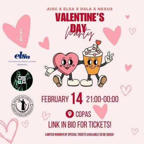 AISG, DSLA, ELSA, and NEXUS are teaming up to host the biggest Valentine’s party in the city! Whether you're looking to meet new people, enjoy a night out with friends, or even find love, this is the perfect way to unwind after exams. Tickets are €5 (€5.50 with a free shot), with door tickets available for €6.50. Want to add some excitement? Fill out the compatibility form and let fate do the rest. See you at Copas from 21:00 to midnight!