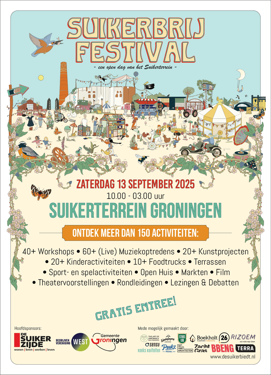 On Saturday, September 13, the third edition of the Suikerbrij Festival takes over the Suikerterrein with a free, all-day program for young and old. After attracting 15,000 visitors last year, the festival returns bigger than ever with workshops, markets, kids’ activities, live music, theater, art, and cultural performances across multiple stages. Highlights include hip hop showcases, world music, theater acts, a green tasting experience, hands-on workshops from building boomhuts to making insect hotels, and the official opening of the BouwHub050 featuring a performance by WatAans!. With its mix of creativity, sustainability, and community spirit, Suikerbrij Festival has quickly become one of Groningen’s most vibrant celebrations.